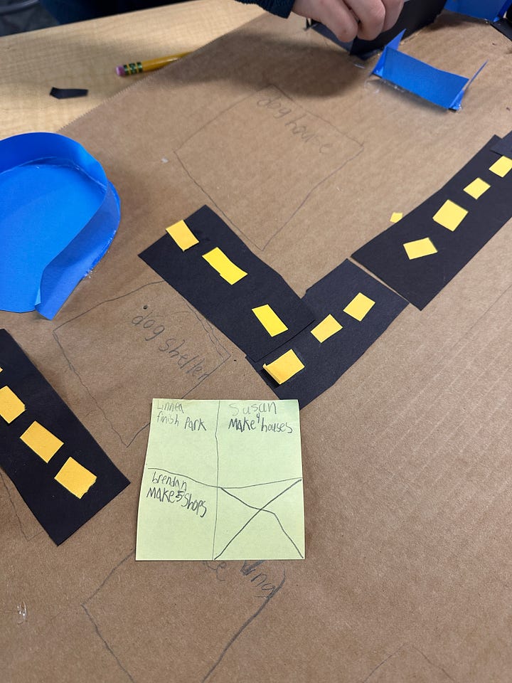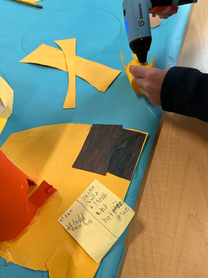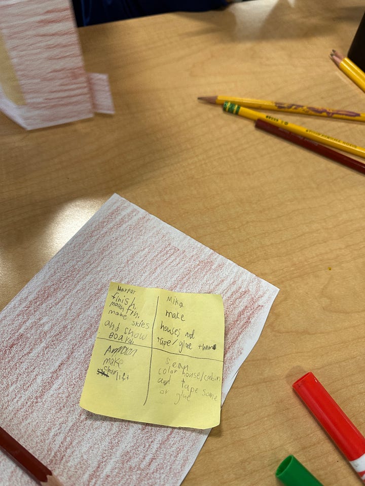 Let’s use one of my current 2nd grade classes as an example. They are currently engineering paper to create cardboard communities as a backdrop to their stop-motion animation film. They have nine, 45-minute class periods to complete this project before we move on. The project includes creating a fictional world and building structures that exemplify the theme of that world. This would range from “Snow Lumberjacks” to “Artist Communities” to “Beach”.